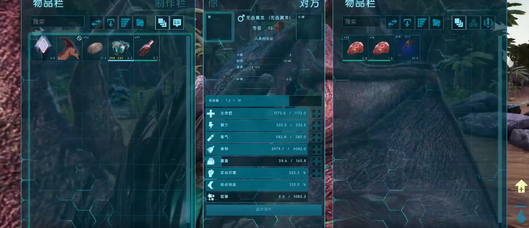 等到翼龙终于被打晕倒地,真正的驯服环节就开始了。赶紧靠近它,按互动键打开它的物品栏。先把准备好的生肉或者优质生肉放进去,翼龙自己饿了就会开始吃,它吃东西的时候那条黄色的驯服进度条才会慢慢往上涨。这里有个非常重要的点,你只能把食物放进去让它自己吃,不要去点那个强制喂食的按钮,强制喂食对增加驯服度一点用都没有,纯粹是浪费食物。