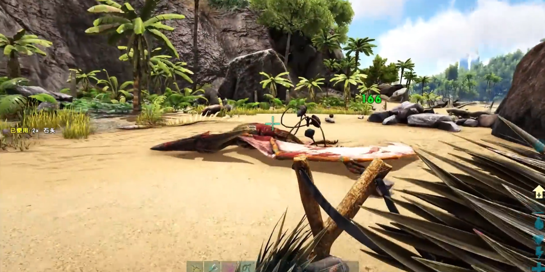 翼龙一般喜欢在海边或者河流附近溜达,找到目标后,趁它落地的时候悄悄靠近。最关键的一步就是使用流星锤,在距离合适的时候快速扔出去把它捆住。捆住之后,你就能放心地掏出木棒或者麻醉箭,对着它持续攻击,直到屏幕上方那条眩晕条涨满,翼龙倒在地上为止。