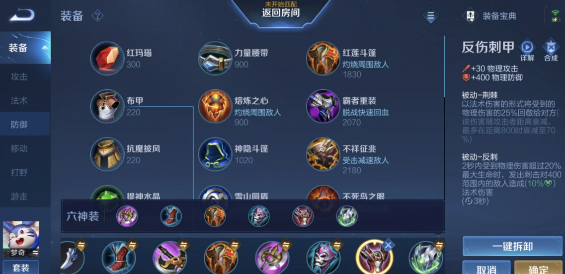 出装鞋子方面优先选择抵抗之靴来减少被控的时间;如果对面物理攻击的英雄比较强势,比如对抗路是吕布、铠,或者打野是韩信,那影忍之足能帮你更好地抗压。第一件大装备通常推荐红莲斗篷,这件装备提供可观的血量和物理防御,它的被动灼烧效果能让你清兵线更快,对拼时也能持续消耗对手,性价比极高。接下来痛苦面具是半肉梦奇输出的关键,它的被动配合梦奇的二技能可以频繁触发,打出不错的消耗伤害,同时它还提供生命值和冷却缩减,全面契合半肉的需求。