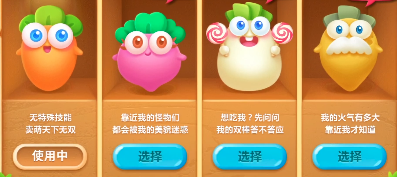 每种萝卜都有各自独特的能力和适用情况,并没有绝对完美的选择。初始角色萝卜没有任何特殊技能,主要优势在于外形可爱卖萌属性十足,适合刚接触游戏的新玩家熟悉基本操作,虽然它在后期关卡中缺乏功能性辅助,但对于前期简单关卡来说完全够用,而且不需要任何解锁条件即可使用。