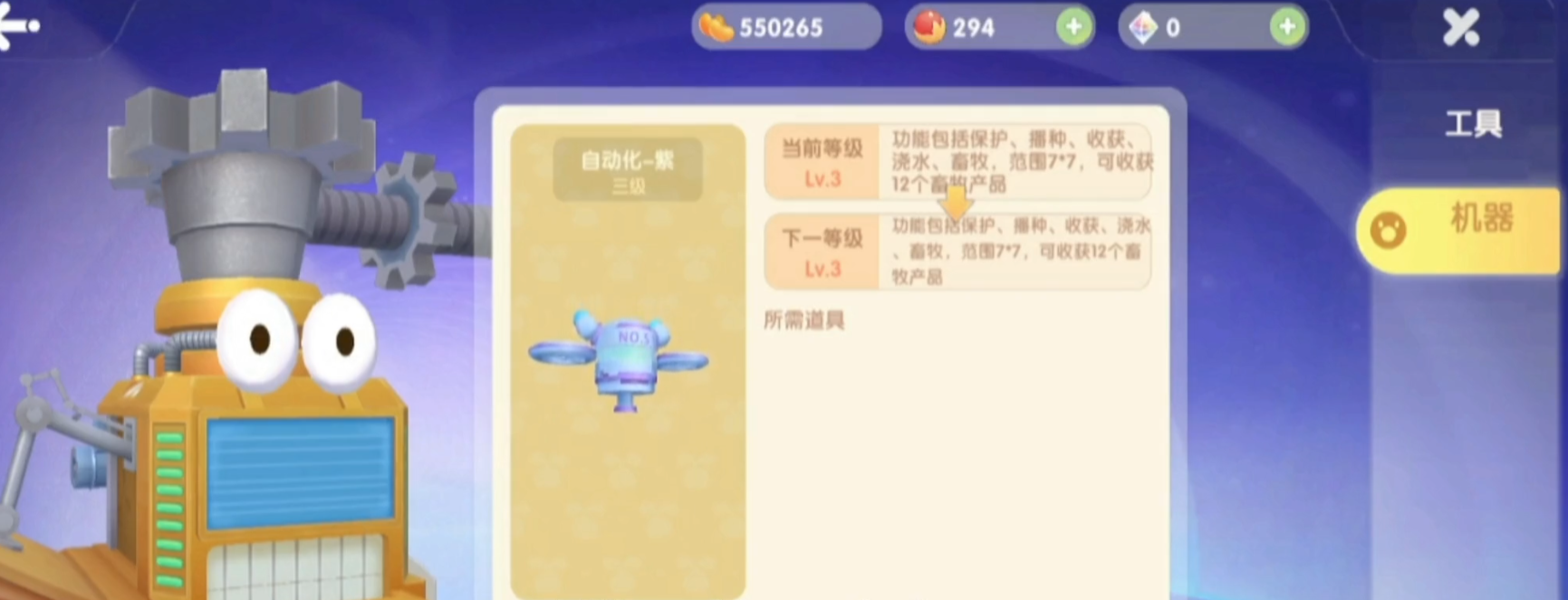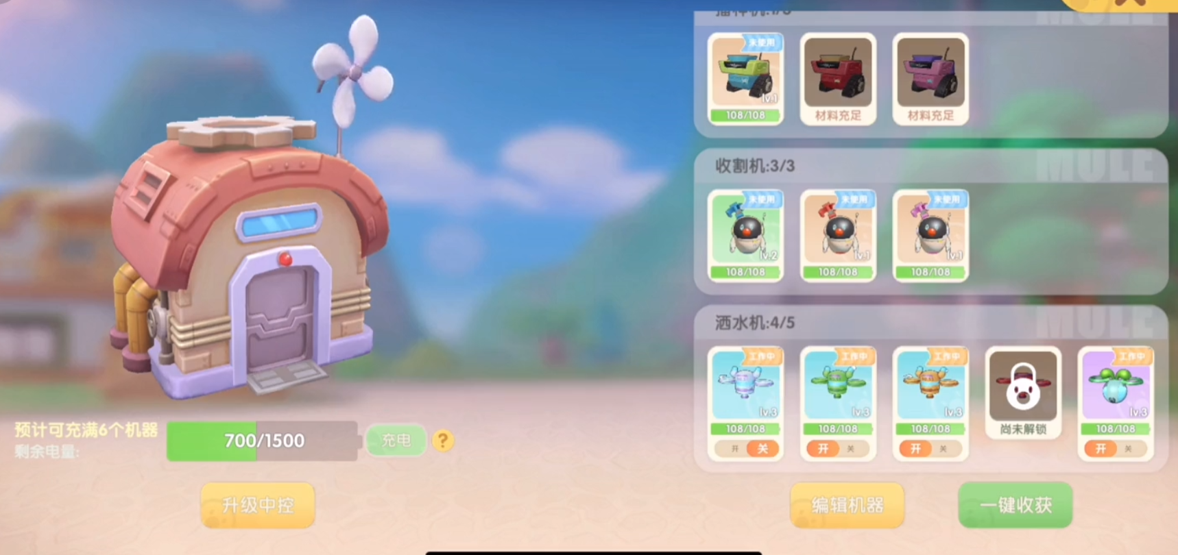 当洒水机电量不足时需要前往家园中那个带有风车的小房子也就是中控台进行充电,靠近中控台点击交互按钮选择充电选项,消耗指定材料就能快速为洒水机补充电量,建议在作物需要浇水时再开启洒水机,浇水完成后及时关闭以节省电力,充电时最好选择夜间或者离线时段进行。除了洒水机外游戏还提供了自动播种机和自动收割机等设备,这些机器都能通过中控台统一管理,合理规划这些自动化设备的使用顺序能让农场管理事半功倍,比如先使用播种机完成播种,再启动洒水机进行浇水,最后用收割机进行收获。毛毛树这类特殊植物就不能使用洒水机进行自动化浇水,必须通过好友互助的方式手动完成。