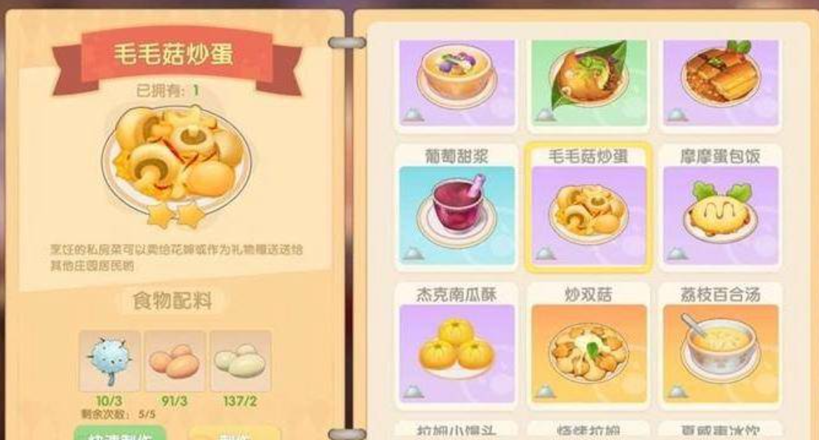 除了炒双菇,毛毛菇还能做另一道招牌菜——毛毛菇炒蛋。这道菜需要毛毛菇加上鸡蛋和鸭蛋,做出来的菜品色泽诱人,在餐厅里特别受欢迎。而拉姆菌则是制作烧烤拉姆的重要食材,这道菜能给餐厅带来不错的收益。记住做菜的时候要掌握好火候,不同的菜品需要不同的火候,多练习几次就能熟练掌握啦。