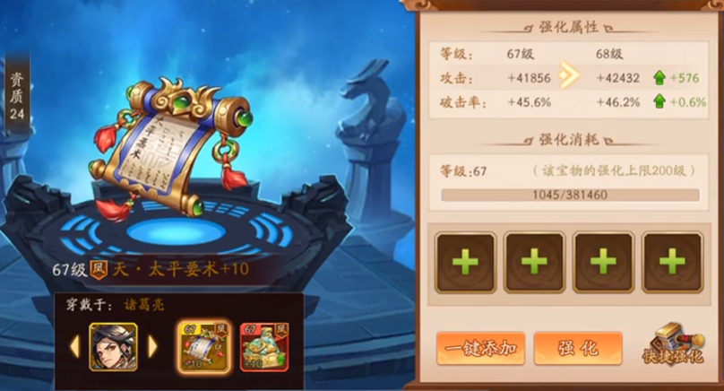 对于新手玩家来说,前期资源有限,不一定非要追求最快速度拿到整件太平要术。你可以把它当成一个中期目标来规划。比如每天坚持完成夺宝任务,慢慢积累碎片;同时合理分配元宝,在商城遇到合适的宝物箱子时可以考虑入手。记住宝物培养是个长期过程,即使拿到了太平要术,后续还需要通过强化、精炼来提升它的属性,同一武将的宝物均衡精炼还能获得额外加成,这些都需要持续投入资源。