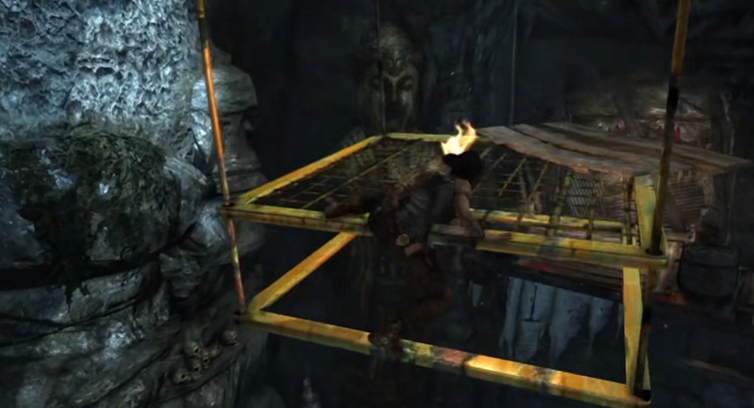 具体进去以后的操作步骤是这样的你先跑到左边跳到那个金属的升降平台上,然后从这个平台再跳到对面的小壁龛或者平台上去,那里通常会有火把或者灯盏可以互动,对着它长按互动键把火把点燃。拿到火以后赶紧跳回刚才那个金属升降平台,用火把把平台上挂着的三个袋子点燃烧掉,这几个袋子就是增加平台重量的累赘,烧掉它们平台就会变轻一些,这是解谜的第一步。做完这个再返回洞口附近的崖边,那里应该有一个可以推动的大箱子或者重物,把它推下去利用杠杆原理,左边的升降机就会开始上升,这时候动作要快一点。