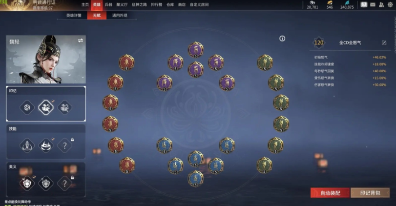 对于新手来说,刚开始接触这个系统可能会觉得有点复杂,但理解其原理后就能很好上手。印记一共有四个系列:红色的本源、紫色的极阴、蓝色的极阳和绿色的万物。每个系列你都可以装备6枚印记,总共24个格子。这些格子会你的账号等级提升逐步解锁,直到46级全部开完。更每一枚印记本身还可以用游戏内的古币进行升级,最高能升到5级,等级越高提供的属性加成就越多。初期获得的古币非常建议优先投资在升级核心印记上,这比盲目开箱子更能实实在在地提升你的战力。