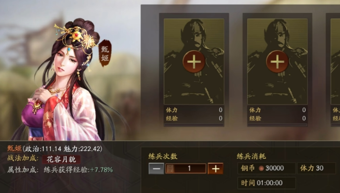 君王殿等级提升到7级后,演武场将解锁练兵功能,消耗铜币和30点体力即可让武将平分单次训练的经验值,演武场等级越高提供的经验越多,委任练兵使还能获得额外经验加成。讨伐野怪能够提供可观的经验值,同时附带装备材料和资源收益,不过需要消耗15点体力和1个策书,建议在资源充裕时集中使用。
