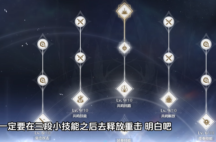 技能加点的优先级普遍推荐以共鸣技能和共鸣回路为最优先,其次是共鸣解放,最后是常态攻击和变奏技能。她的突破需要消耗不同等级的镣环、妙戈花、纷争声核等材料,技能升级则需要对应的镣环、金属液滴和无妄之羽。武器方面,五星武器千古洑流是首选,能提供暴击率与共鸣效率;四星武器中,飞景和可通过锻造获得的斩瞬刀是性价比较高的选择。声骸套装当前版本最优选为沉日劫明五件套,能直接提升湮灭伤害并强化普攻与重击后的输出;主声骸则推荐使用无冠者,以进一步提升湮灭伤害与共鸣技能伤害。词条属性应优先追求暴击率、暴击伤害、攻击力以及湮灭伤害加成。