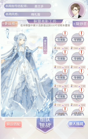 成功完成挑战后,你和你的队友就会掉落一些制作材料,主要是羁绊星砂和回忆水晶。这些材料就是获取套装的关键。拿到材料后,别急着乱用,要回到联盟里的裁影工坊去。所有成员捐献的材料都会汇聚用来协力合成当期推出的凝砂之战专属套装。比如之前出过的密林传奇、镜花拂云、云墨丹青这些漂亮衣服,都是从这里免费做出来的。需合成一个套装部件需要联盟里一定数量的成员一起捐献材料并点击协力,而且每个人每天对同一个部件的协力次数是有限的,第二天才会刷新。所以要想快点拿到衣服,就得靠整个联盟的小伙伴们齐心协力,集中材料捐献同一套套装。