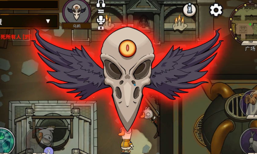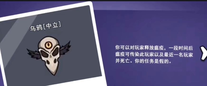 乌鸦是一个隶属于中立阵营的特色角色,其核心技能是向附近的玩家释放瘟疫。该技能冷却时间较长,为30秒,需要玩家审慎把握使用时机。被瘟疫感染的玩家在大约10秒后,会将瘟疫传染给与其距离最近的一名其他玩家,并导致两人同时阵亡;若感染期间目标始终处于落单状态,则其会独自死亡。乌鸦的所有任务均为虚假任务,因此玩家无需像鹅或鸭阵营那样专注于完成任务或破坏,可将全部精力用于策划瘟疫的传播与局势操控。