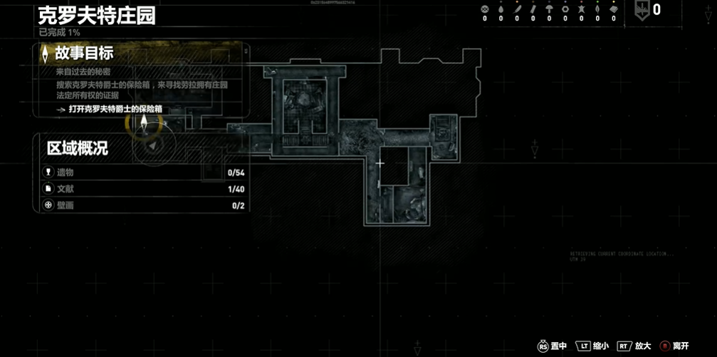 游戏在克罗夫特庄园的书房中开始,劳拉需要在此场景进行初步探索与关键物品收集。转身后首先可在书桌左侧找到一份名为第一印象的文件,属于克劳馥爵士日志;书桌另一侧则摆放着宝物劳拉戴着埃及皇冠的照片。房间内的绘图板上固定着北叙利亚古代地图,而绘图板后方有一个可以拉开的柜子,里面藏有另一件私人物品神话背后的真理。这些文献与遗物是了解剧情背景与家族历史的重要线索,收集它们构成了探索的第一步。