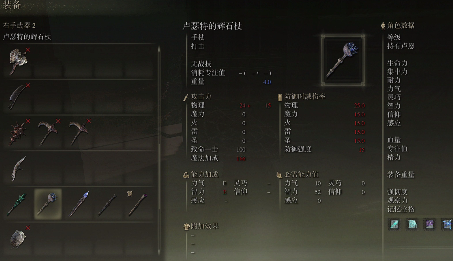 高等级的属性点为装备选择带来了极大的自由度。武器方面,死王子杖是智力信仰双修流派的毕业选择,卢瑟特的辉石杖能提供最高的纯魔法伤害加成。近战备用武器可以选择暗月大剑或名刀月隐,它们能很好地弥补法师的近身短板。护符必带魔法师球护符和拉达冈的肖像来提升伤害与施法速度,其余槽位可搭配魔力对蝎、献斗剑或增加抗性的珍珠龙徽护符等。防具不再局限于轻甲,可以选用老将套、忌讳套等韧性更高的中甲,通过堆叠韧性来确保施法过程不被轻易打断。