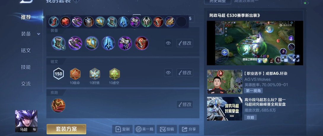 马超秒杀脆皮的核心出装为冷静之靴、暗影战斧、宗师之力、无尽战刃、破军和名刀·司命,这套装备兼顾冷却缩减、暴击率和物理穿透,能最大化强化普攻的爆发伤害。其中暗影战斧提供的基础属性与宗师之力的强击被动形成联动,配合无尽战刃的暴击效果可在拾枪后实现瞬间秒杀。需要注意的是马超伤害与移速挂钩,疾跑召唤师技能是必备选择。
