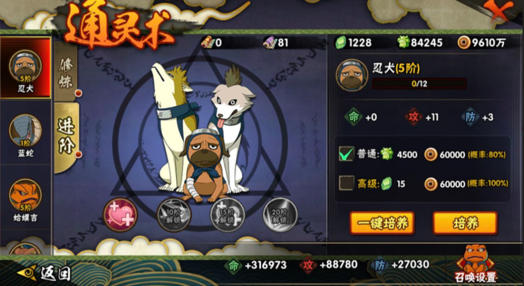 通灵兽的解锁是循序渐进的,每只通灵兽都需要前一只修炼到满级才能激活下一只。比如忍犬要练到50级满级,才能开启蛤蟆吉或者其他通灵兽。修炼通灵兽主要靠消耗铜币和声望,这些资源可以通过日常任务、试炼之地或者活动慢慢攒。记得每天把能做的任务都做完,这样资源积累会快很多。
