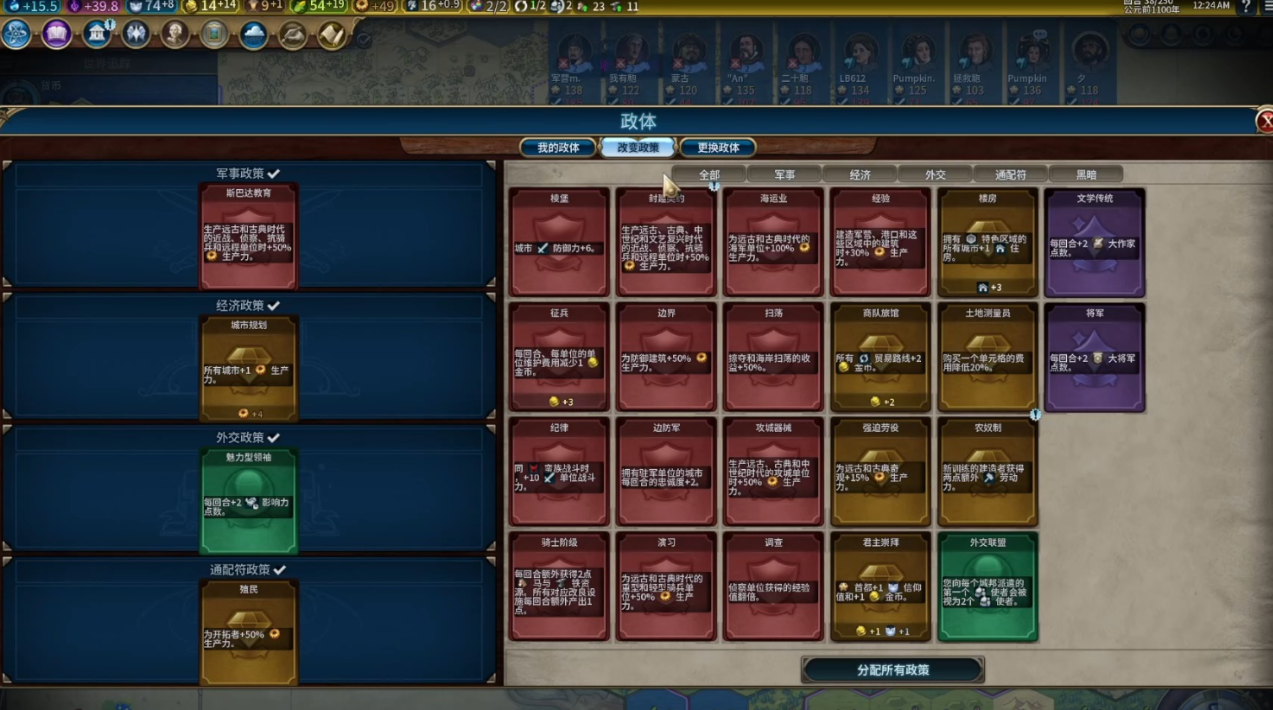 如果走文化或科技胜利,古典共和是更好的选择。它给的伟人点数能加速大科、大艺的获取,配合老秦的奇观加速特性,很容易在中期形成滚雪球效应。这个政体的经济加成能让咱们更快买工人和移民,毕竟老秦的工人多一次使用次数,频繁爆工人是核心玩法之一。古典共和对军事帮助不大,如果邻居比较凶,可能需要额外造点兵防守。