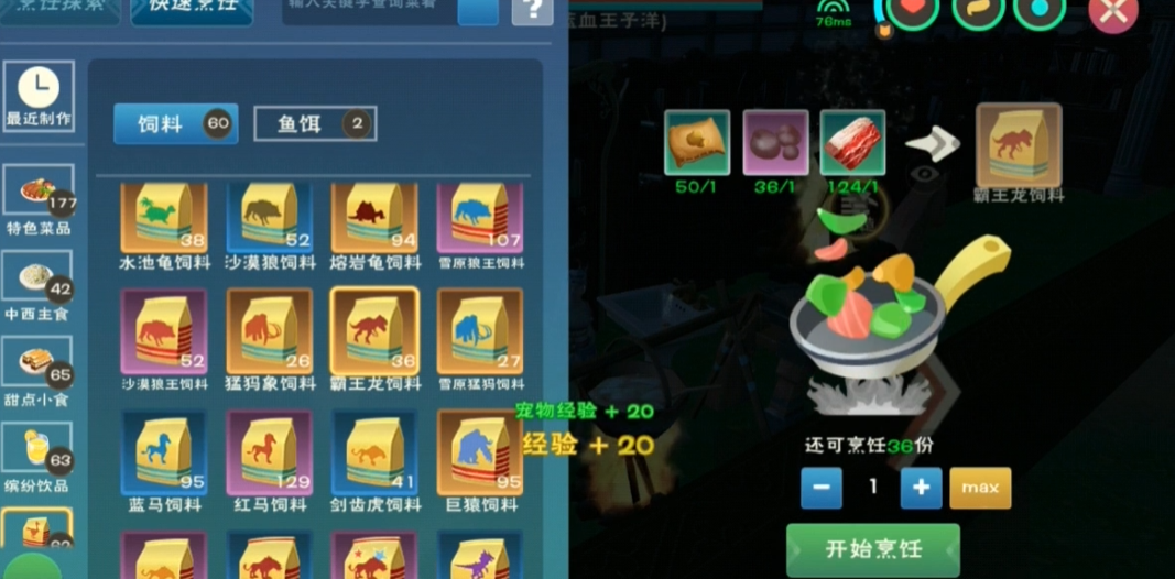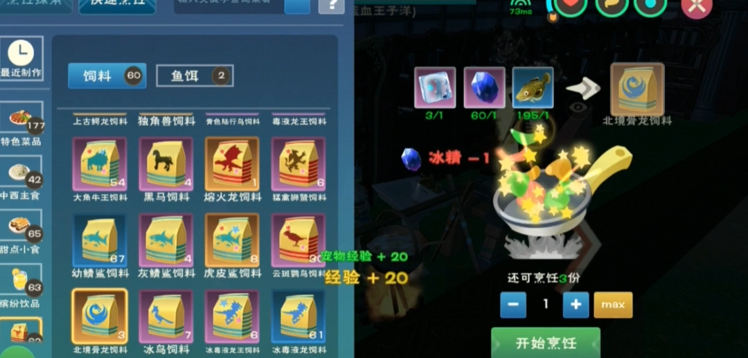 霸王龙饲料的制作流程较为典型,需将松露、土豆饲喂料和优质饲喂肉块放入烹饪锅,点击制作即可。类似地,熔岩龟饲料需要鲤鱼和大闸蟹,而魔法灵龙饲料则需要大闸蟹、绛紫果实和蓝莲。材料分布具有地域性,例如大闸蟹多在北境水域用蚯蚓垂钓获得,蓝莲则需在地图刷新点采集。