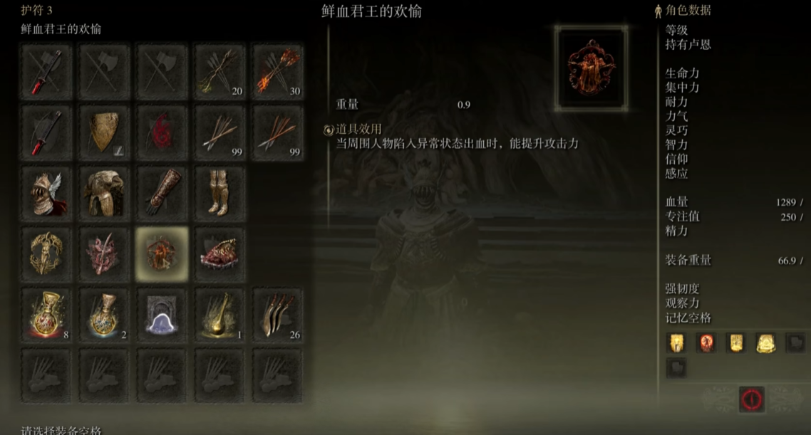 装备搭配上记得选增加感应或者出血效果的护符,比如鲜血君王的欢愉或者腐败眷属的欢愉。防具不用太纠结,选一些轻甲保证翻滚灵活性就好,毕竟灵感流更依赖输出节奏而不是硬扛伤害。战技方面切腹是必带的,它能大幅提升出血积累速度,配合高感应属性可以让敌人快速进入出血状态。另外记得带一把轻便的副手武器,比如肋差或者匕首,用来触发双持特殊攻击或者补刀。