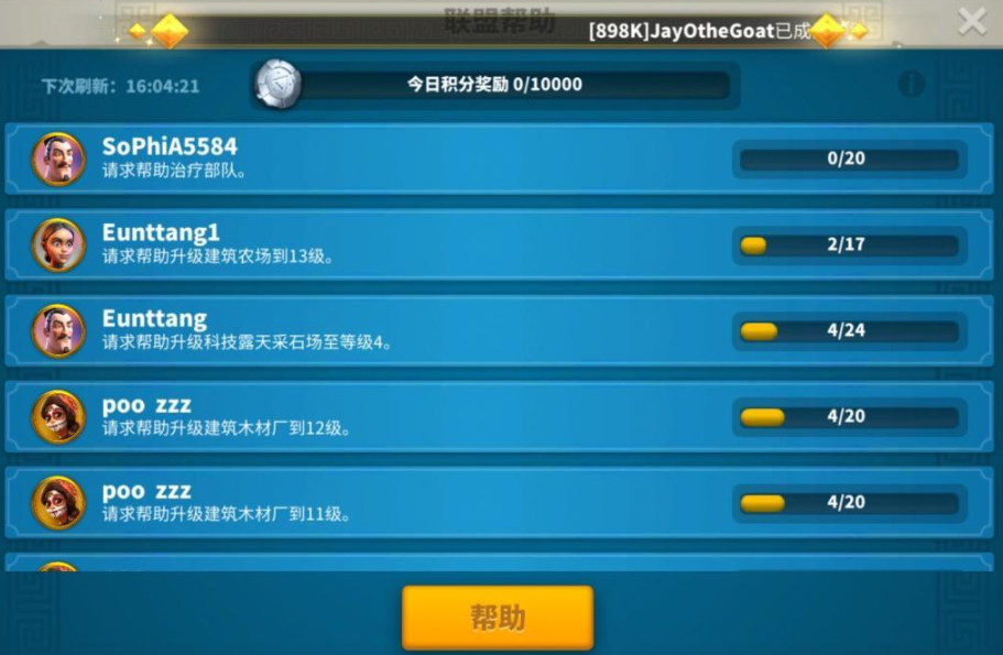 和盟友搞好关系,互相协助完成任务,效率会高很多。有些活动需要团队配合,提前沟通好分工,避免重复劳动。记住积分是跟着个人走的,就算换了联盟也不会消失,所以放心大胆地积累吧。多余的资源别囤着,捐给联盟既能帮助发展又能换积分。金币、体力这些都可以捐,捐得越多积分越多。建设旗子时有个小技巧,晚上睡觉前派一个兵慢慢建,建造时间越长积分越多。每天的建筑积分上限是2万,合理规划就能拿满。