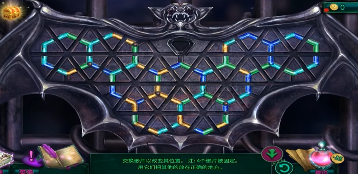 将收集到的三个金属蝙蝠部件与桩子组合,插入铁门上的蝙蝠机关并完成嵌片小游戏。嵌片调整需遵循颜色匹配规则:首先交换最右侧固定嵌片下方的发光嵌片,确保与连接处颜色一致;随后依次处理上方、左侧及中间嵌片,通过颜色比对逐步完成所有嵌片的正确排列。全部嵌片亮起绿光后,蝙蝠机关激活,门将开启。从铁门下石碓取得石头,利用剪刀剪开棺材中的织物获取桩子,或通过拼图解锁隐藏部件。