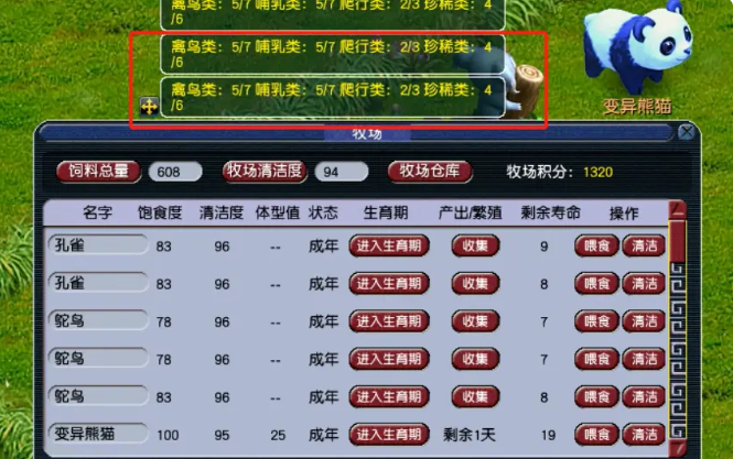 牧场出窝的核心在于动物健康管理、繁殖操作技巧以及日常维护的稳定性。保持动物饱食度在85以上是基础条件,清洁度必须每日清理至满值,这两项直接影响动物的健康状态和繁殖意愿。健康值低于90的动物将无法繁殖,因此清洁和喂养是每天必须完成的基础操作。饲料投放需根据动物种类调整,例如珍稀类动物如熊猫需保持更高饱食度,而禽鸟类可适当放宽标准。