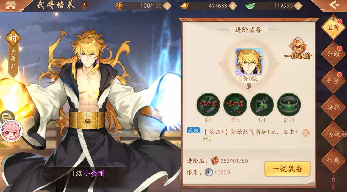 小金刚的缘分加成与装备选择对其强度影响较大。穿戴全套金装时,可通过缘分获得攻击与生命各60%的加成;若配备紫金装备,加成比例提升至80%。神兵推荐青龙偃月刀或七星宝刀,前者增强输出能力,后者更适合依赖技能频率的阵容。由于小金刚的杀意值依赖友军行动恢复,通常建议将其置于三号位,搭配七星宝刀可更快触发必杀技。