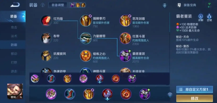 破军的高额物理攻击力及对残血目标的额外伤害,大幅提升曹操的收割能力,是其核心输出装。不死鸟之眼针对法术威胁,提供法术防御与生命值,其被动效果能按比例增强曹操大招的吸血效率,使残血状态下的回复量更为可观。若敌方法术爆发较高,可替换为魔女斗篷,其护盾能有效抵消关键技能伤害。