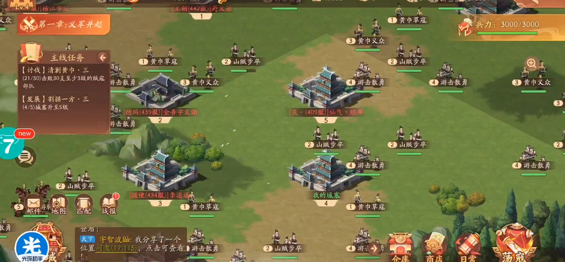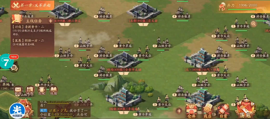 逐鹿天下是少年三国志2中一个融合了策略与战斗的跨服玩法,玩家进入活动后会降落到新地图的出生州并获得专属城塞。初始阶段需要优先升级主城以提升兵力上限,通过击败野外流寇获取资源,流寇等级随玩家实力提升而提高,战斗采用回合制兵力消耗机制,任何一方兵力归零即判定胜负,平局则双方回城且敌方兵力状态保留。行军过程中士气会随时间下降,比例约为1:10,但在己方阵营内行军无消耗,主城扩建后可解锁士气回复功能且无上限。