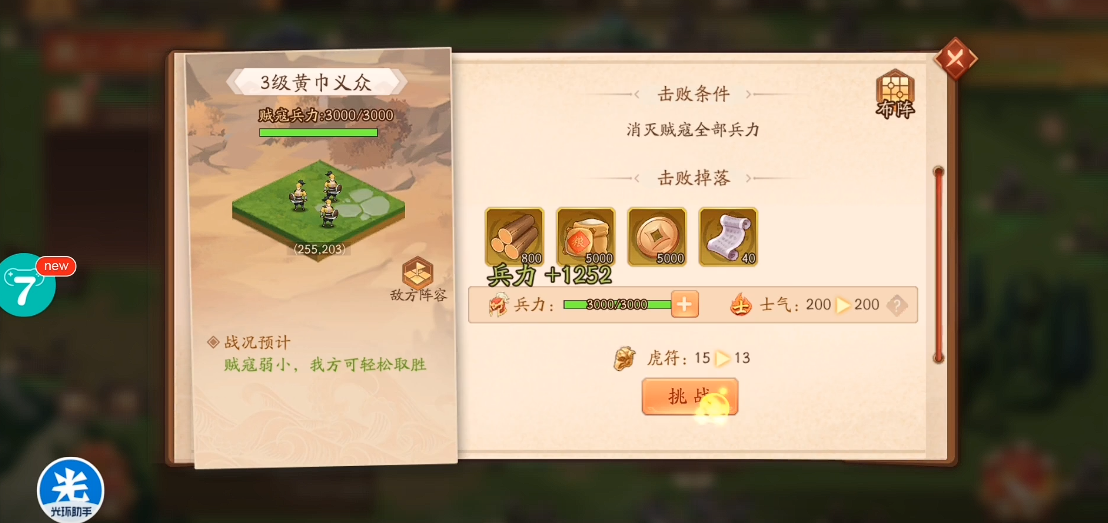 资源管理与兵力补充是玩法核心,军粮用于招募士兵,木材和石料则用于城池升级,6级后城池升级需石料且仅能通过击败精英怪获取。玩家需合理分配行动力,每日建议消耗5000元宝购买粮草以保证持续作战能力。战斗分为PVE和PVP两种模式,PVE挑战野怪时需注意敌方可能携带高阶军备,这类装备具备恢复、反伤等特效,会显著增加战斗难度与兵力损耗。PVP允许玩家互相攻击并俘虏对手,但驻守兵力会消耗大量资源且俘虏可自救,建议仅派遣最低兵力驻守。