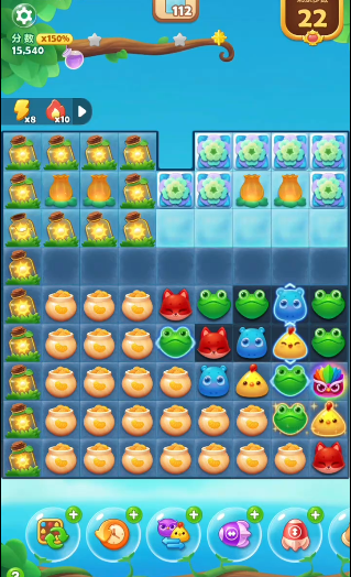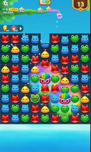 开局应优先观察底部中间区域的消除可能性。金豆荚需经由传送门下落,而传送门初始常被雪块覆盖。故首要任务是集中火力消除底层中间位置的雪块与动物,打通传送门激活路径。操作时需有意识地向中间区域引导消除,避免无谓地扰动两侧边缘位置的动物。因为金豆荚若卡在两侧边缘,将极难引导其下落,应尽量减少对边缘格子的操作,将活动范围控制在中间主体区域。早期消除应致力于扩大底部中间的空间,为后续特效制作和闪电鸟激活创造条件。