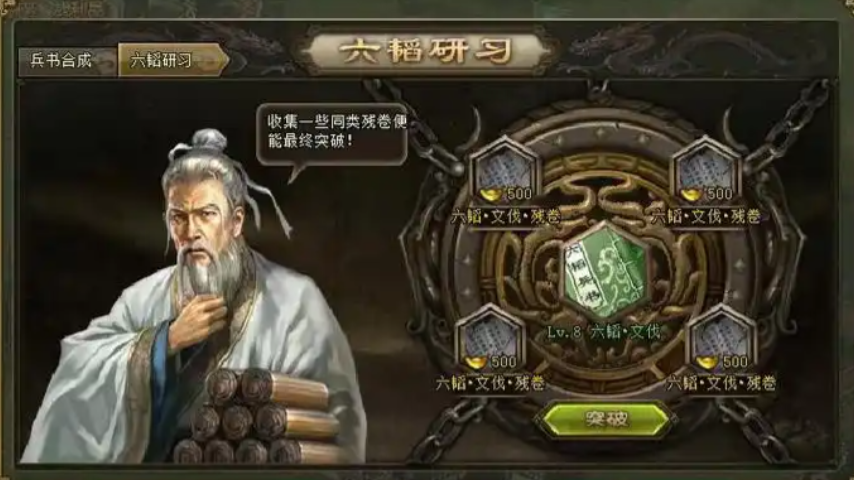 二十四篇兵书在阵法系统中具有战略价值。当安装在任意阵法上时,能让普通八卦阵进化为四象八卦阵,这种强化阵法不仅能给武将带来显著属性加成,还能触发天人合一特效及其他特殊效果,攻城战中往往能起到扭转战局的作用。兵书升级过程需要精心规划资源分配,因为每种六韬兵书所需投入的代价不同,需根据自身战斗风格和阵容特点选择性升级。