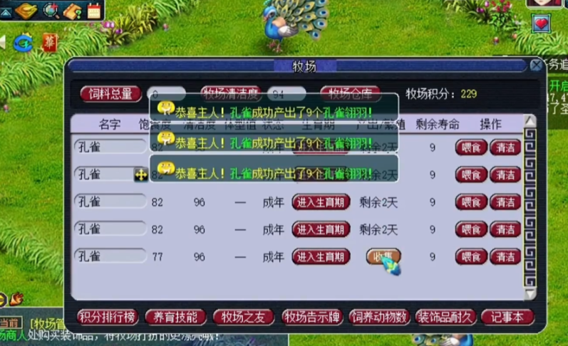 携带成年动物拜访至少20名活跃牧场好友,连续每天访问触发动物采购员或守护兽事件,采购员用现金收购成年动物,守护兽合成高级产出提升积分收益。繁殖时点动物繁殖功能,每只动物可尝试3次,亲密度越高越易获得额外宝宝窝,需注意饱食度81以上繁殖成功率高,单开玩家建议避免珍稀类以降低断窝风险。