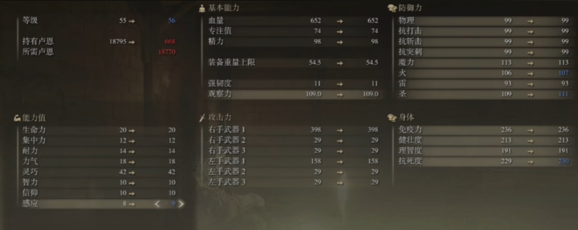 加点细节方面,新手建议先堆生命值到20点再补输出属性,老手可以激进点主加灵巧。到了140级,属性分配大概是生命40、集中12、耐力25、力量30、灵巧60、感应15,剩下的点数看个人喜好。如果喜欢玩双太刀,记得把力量点到18以上方便换装。感应对出血流有帮助,但不用刻意堆太高,15-20点足够触发效果。蓝条不用太在意,武士主要靠物理输出,战技偶尔放放就行,喝口蓝药就能解决续航问题。