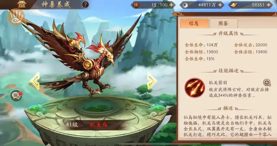 吴国玩家选择神兽的核心思路是围绕灼烧机制和爆发输出来展开,机关鸟作为标志性的吴国神兽是最基础的选择,它的技能机关箭雨能在敌方武将阵亡时对后排造成大量无视防御的神兽伤害,并有概率附加灼烧状态,这种群体输出与灼烧效果的结合完美契合吴国武将高火属性伤害的特点,形成持续压制的战术体系,而且机关鸟的触发机制简单直接,只需击杀敌方单位即可激活,非常适合追求爆发输出的新手玩家。