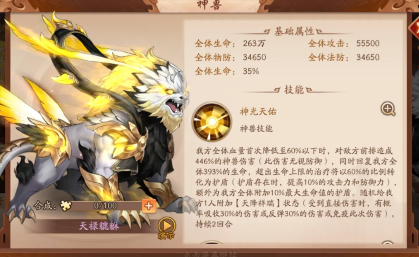 天禄貔貅作为紫金治疗神兽,在特定血量阈值触发群体治疗,溢出治疗量转化为护盾并提供攻防加成,比传统治疗神兽更适配吴国的持久战需求,神木青鸾也是不错的治疗型神兽选择,拥有概率进入治疗状态的技能效果,相当于额外增加了一个治疗武将,搭配吴国阵容能大大提升整体防御能力,让队伍在战场上能多坚持几个回合。
