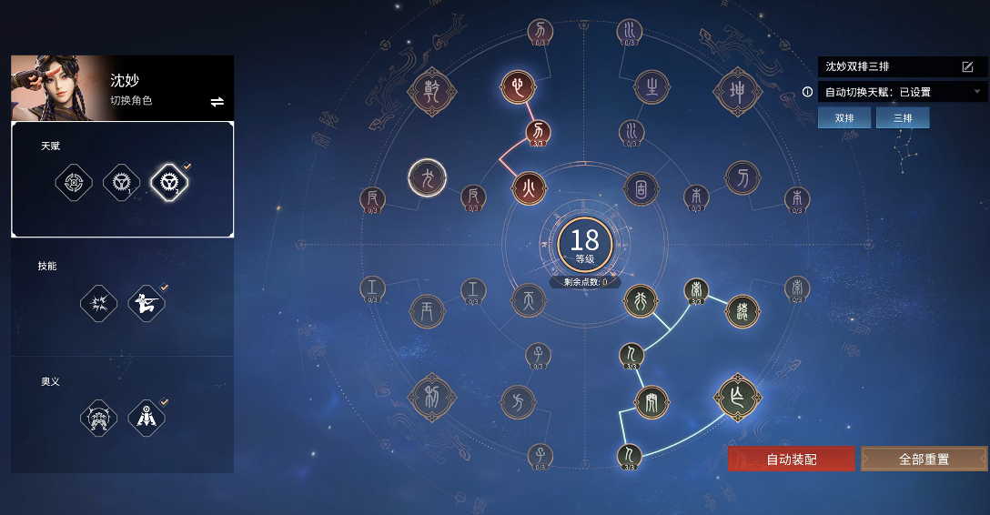 沈妙作为剑阁锻造师之女,在战场上拥有独特的机甲变身机制与灵活位移能力,因此在印记选择上应侧重提升其生存与机动性。本源印记中推荐搭配体能来增强每秒精力回复,确保她在频繁使用技能与闪避时不会过快耗尽精力值,同时坚韧印记能减缓魂冢能量损失速度,为她在危险局面中争取更多反击或撤退的机会。极阴系列的暴怒与反噬分别提高伤害怒气转换与受伤怒气转换效率,配合沈妙依赖奥义变身的特性,能更快积攒大招开启机甲形态。