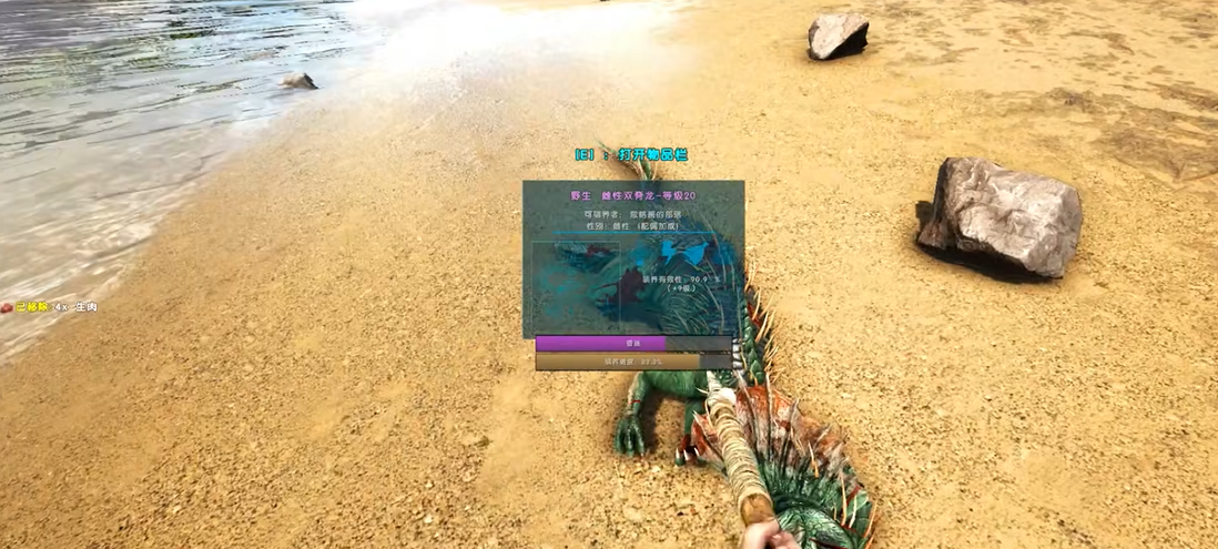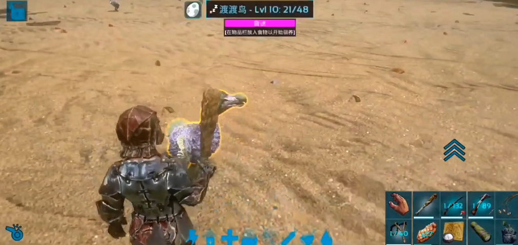 找到心仪的恐龙后,想办法把它引进困龙房或者堵在角落。拿出弹弓或麻醉箭,瞄准它的头部或身体薄弱部位攻击,看到它开始摇头晃脑就说明快晕了。千万控制好力道,别下手太重直接打死了,尤其是血量低的龙可得悠着点。等它彻底躺倒,你靠近按互动键就能打开它的背包。把准备好的肉或果子放进去,它会自己开吃,这时候你能看到两个进度条:紫色的昏迷槽会慢慢减少,金色的驯服槽进食一点点上涨。