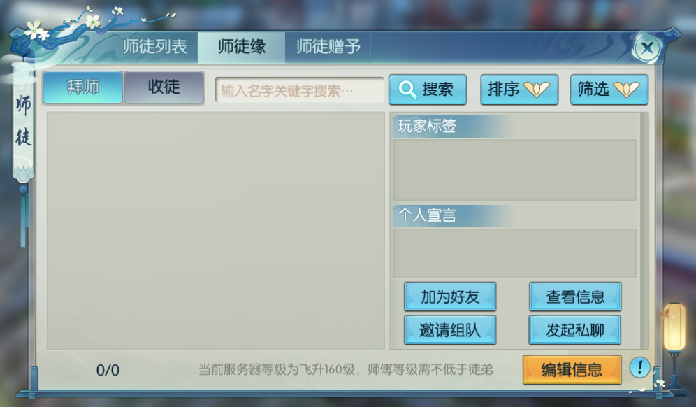 收徒存在明确的等级限制:师傅角色需达到70级或以上,而徒弟角色等级需≥10级,且师傅等级必须高于徒弟至少5级。一名75级的师傅可收取10-70级的玩家为徒。若徒弟等级超过限制或双方等级差不足,则无法触发任务。师傅需确保自身未处于其他师徒关系中,且拥有可用的徒弟名额。