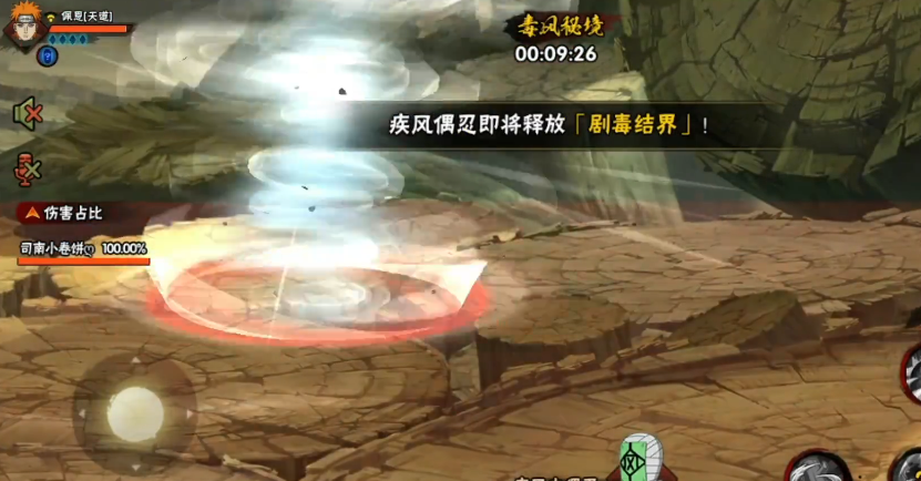 清掉两个风之偶忍之后,结界就会消失,但千万别放松。结界消失的瞬间,领主放的那股强力旋风会从结界里冲出来,在全场乱窜,如果躲不好很容易被一套带走,特别是之前已经在结界里掉过血的玩家。比较安全的做法是,在结界快消失时,就控制你的忍者紧贴着地图最下方的边缘移动,这样有很大概率能躲开旋风的路径,安全地接近领主。找到领主后,战斗就进入第二阶段。