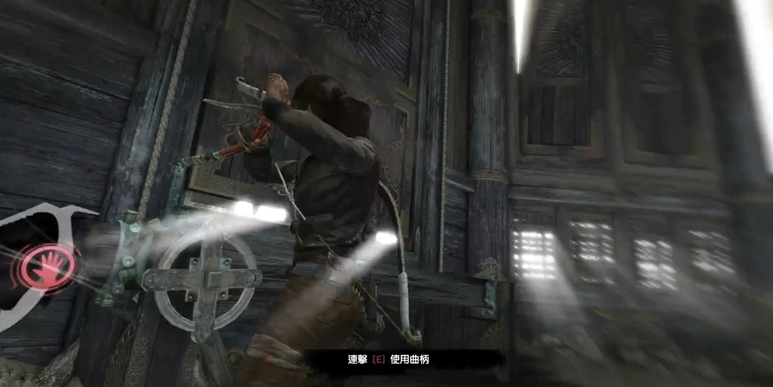 第一步是去窗户边上的机关那里,逆时针旋转曲柄打开其中一扇窗户。这样强风就会吹进来,接着你就要使用弓箭上的绳索箭,瞄准大钟或者钟摆射击并用力拉回来,借助风力让钟摆撞击大钟旁边的木柱。如果发现撞击力度不够,就调整位置把钟拉到更靠近风口的地方,确保它能撞烂一边的支撑柱。完成这一步后记得关上这扇窗户,为下一步做好准备。