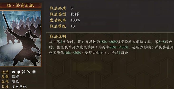 鲁肃的济贫好施战法不光在第二回合移交属性,还在第3到5回合为兵力最低的友军提供治疗和减伤效果,治疗率最高能达到284%,减伤也有26%左右,受智力影响,所以玩的时候你会感觉这个辅助特别靠谱,不会轻易被敌人打断,后续的治疗效果能帮你稳住队伍的血线,让战斗打得更久一些。