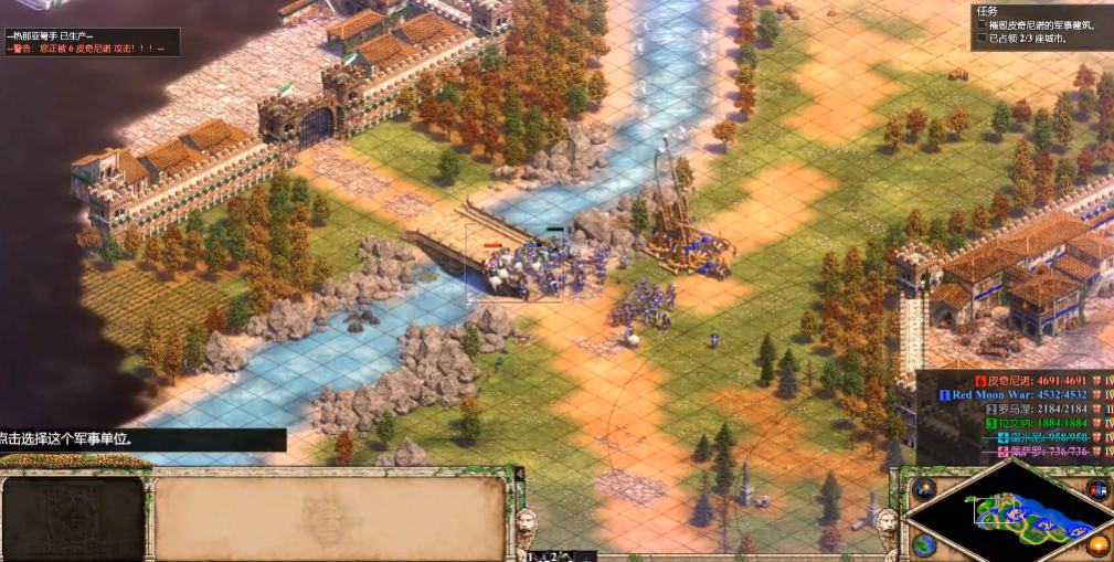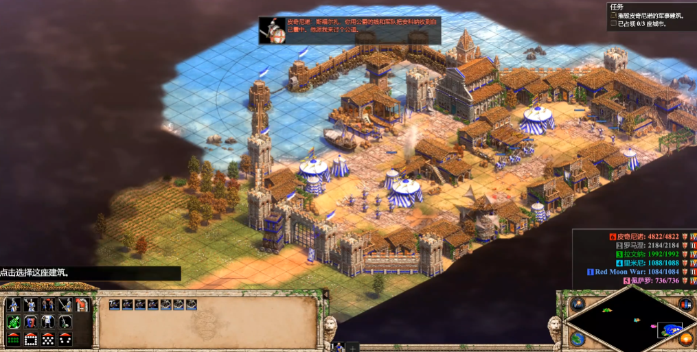 中期的发展阶段要注意出巨型投石机这种攻城武器,这是拆家的关键。首先用巨型投石机把皮奇尼诺在北边的基地拆掉,接着就可以进攻拉文纳了。操作方法和之前差不多,还是想办法引出守军,然后让僧侣放圣物完成占领。这时候敌人会不断地派兵来骚扰你的基地和前线部队,所以建议在营地周围修些城墙和箭塔来加强防御,特别是要防住敌方轻骑兵的快速突袭,保护好你的村民和资源点。经济方面要持续运营,保证食物和木材的稳定供应,以便持续生产部队。