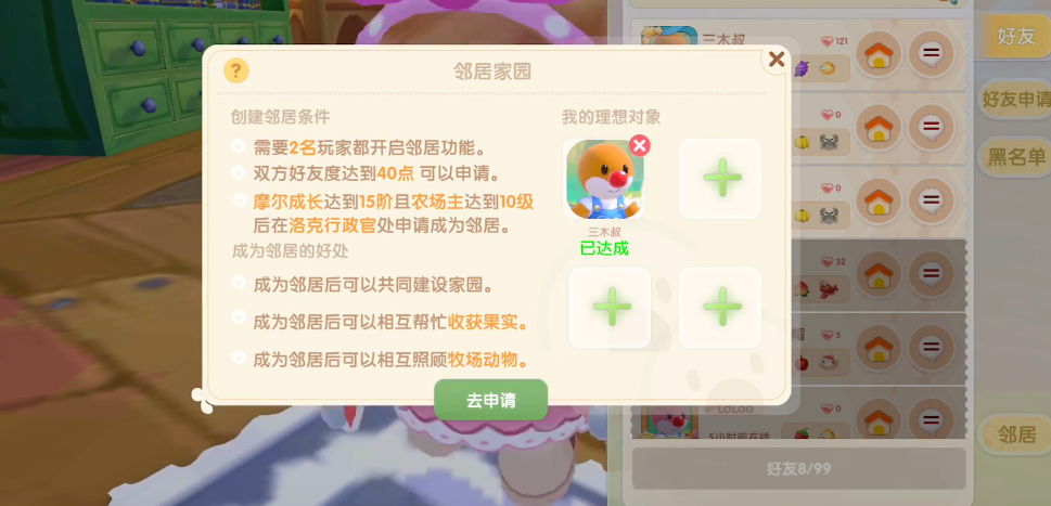 当所有条件都满足后,就可以去找摩尔城堡的行政官洛克提交邻居申请了,在好友界面点击邻居按钮,选择想要成为邻居的好友,然后点击去申请按钮,按照提示操作即可,提交申请后需要等待对方同意,如果对方暂时没回应,可以耐心等待或者友好地提醒一下。