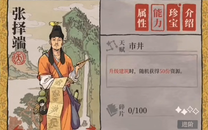 张择端的天赋是其价值的核心,具体效果是提升建造属性,并在建造新建筑时额外获得50份随机资源。这份额外的资源获取在游戏初期或建设新区时尤其宝贵,能有效缓解资源压力。这也决定了他的最佳使用时机,是在需要大量建造且资源吃紧的前期开荒时段,或者在中后期当你集中人力进行大规模建造和理财规划时。他的技能也涉及对商业建筑的加成,能在管理商业区时提升所有店铺、市场设施的收益,对城市的经济繁荣有推动作用。