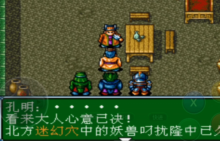 成功穿越黑暗迷宫后,玩家将面对本环节的守关BOSS幻兽-龙王。击败它是解救刘备的关键一步。在迷宫探索过程中,玩家可以获得一些有用的道具,例如在两个黑暗房间之间的过渡区域,地面上设有八卦符,调查后可以为整个队伍回复全部HP与MP,效果等同于入住客栈,务必利用以保持队伍状态。在迷宫内的某些罐子中,还可能找到诸如防止异常状态的宝马麒麟等实用物品。