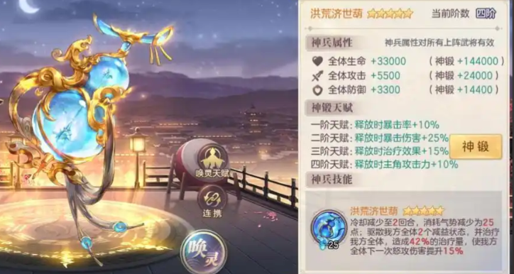 除了上述两者,还有一批强度很高但在特定方面有所侧重的神兵。太凰射日弓是多段伤害的总输出冠军,你的武将释放怒攻越多,它射出的箭矢也就越多,伤害非常可观,并且它的伤害会附带灼烧效果,特别适合持续作战的阵容。洪荒济世葫是游戏中唯一的回血神兵,能治疗全体队友并增加下次怒攻的伤害,三星后解锁驱散负面状态的能力,是持久战和缺乏回复队伍的重要保障。苍天帝剑是一把锁定敌方生命最低目标的单体输出神兵,成功击杀后能给己方核心回怒回血,具有一定的收割和续航能力。天墟盘龙斧则专攻敌方后排,能够标记目标使其受到的神兵伤害大增,与切后阵容搭配效果极佳。