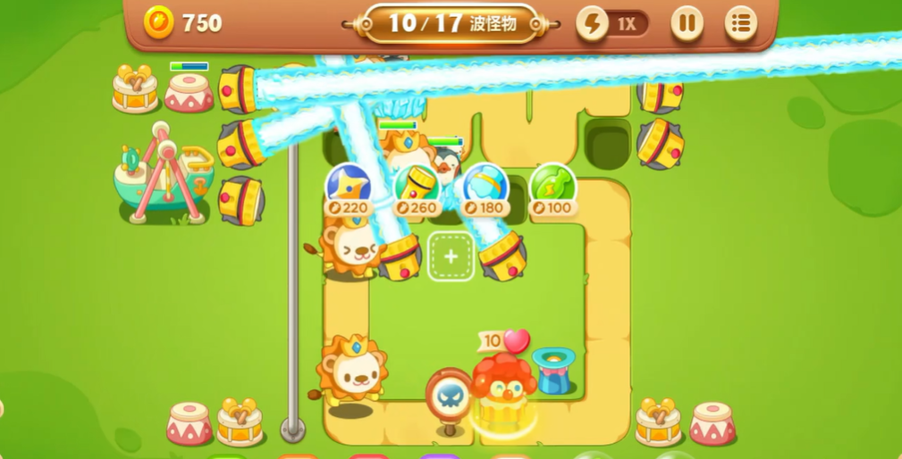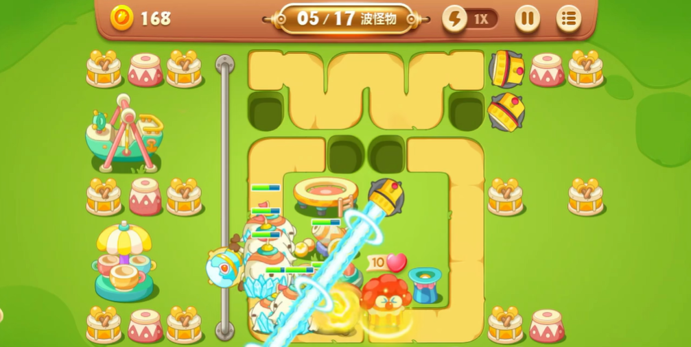 开局阶段,核心思路是优先清理障碍物以获取金币并开辟防御空间。一个被广泛验证有效的策略是,首先使用忍者镖这类伤害较高的炮塔来攻击地图中央的障碍物。在清理出部分空间后,应立即在空位上补充并升级忍者镖,建议将其升至满级以最大化输出效率。考虑到减速控制的重要性,可以在合适的位置,例如右上角,尽早放置一个雪球炮塔来减缓怪物行进速度。