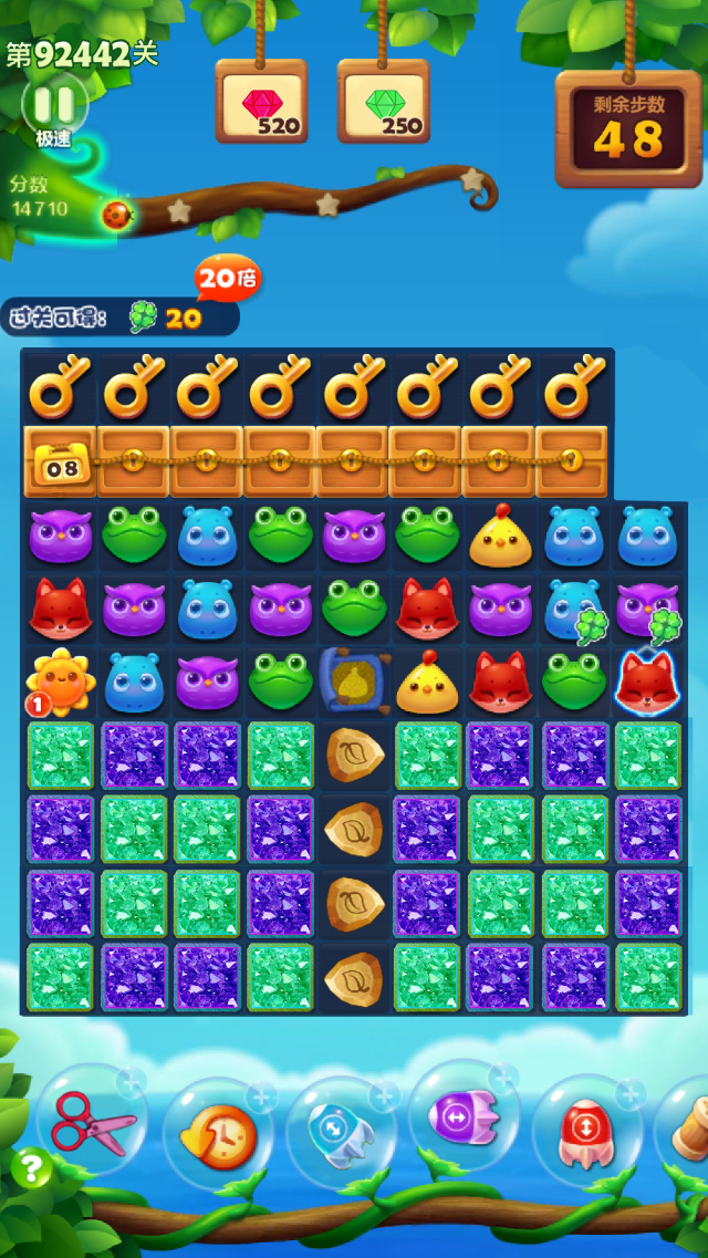 道具是应对黑毛球的重要辅助手段,在步数紧张或黑毛球位置刁钻时合理使用可快速突破困境。小木锤可直接对单个黑毛球使用,一次操作即可让黑毛球进入眩晕状态,节省寻找消除机会的步数;强制交换道具可调整黑毛球周围小动物的位置,快速凑出三消组合;刷新道具能在黑毛球密集且无消除机会时,重新排布棋盘元素,为消除创造新可能。使用道具时需精准把控时机,优先在黑毛球即将阻碍关键特效合成或步数即将耗尽时使用,避免道具浪费,确保每一步操作都能推进黑毛球的消除进度。