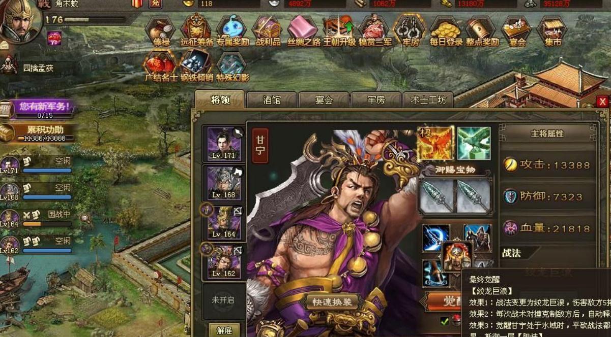 御宝洗练需结合战法将类型与战斗场景微调,纯输出战法将如吕布、孙尚香,御宝以统帅、战法威力、定军、强攻为核心,完全舍弃防御属性,追求极限输出,适配攻城、国战突击等进攻场景。半肉型战法将如赵云、甘宁,在保留统帅、战法威力的基础上,增加血量与不败属性,不败可减少第二排部队受到的战法伤害,提升站场能力,适配持久战与副本挑战。资源有限时优先集中精粹与木炭培养主力战法将的1-2件核心御宝,先洗出三星核心属性即可成型,无需盲目追求全满值词条,御宝突破至5级后,全三星属性可激活额外特性,进一步提升战力,此时再逐步优化属性至满值。洗练过程中要合理分配材料,通过副本、活动稳定积累木炭与精粹,避免材料分散导致御宝养成进度停滞,确保核心战法将的御宝属性优先成型,带动整体阵容战力提升。