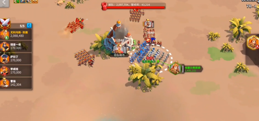 野战策略需充分利用地形与联盟科技加成。在己方联盟领地作战可享受行军速度与攻击力提升效果,借助盟友城市实现战术性隐蔽。面对高战玩家时可采用游击战术,利用理查一世等治疗型统帅消耗对方兵力,或通过源义经的觉醒技能对靠近驻防建筑的敌人造成致命伤害。低战力玩家可通过和平护盾规避攻击,但需注意使用时机。