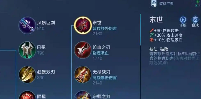 末世和制裁之刃不仅能提供可观的物理吸血,还能克制回血型英雄。特别是遇到程咬金、蔡文姬这种赖皮英雄时,制裁之刃简直就是神器。如果对面没有强力回血英雄,优先做泣血之刃会更舒服。吸血刀配合红buff效果特别好,平A几下血条就回上来了,能让你在团战中多站几秒钟。