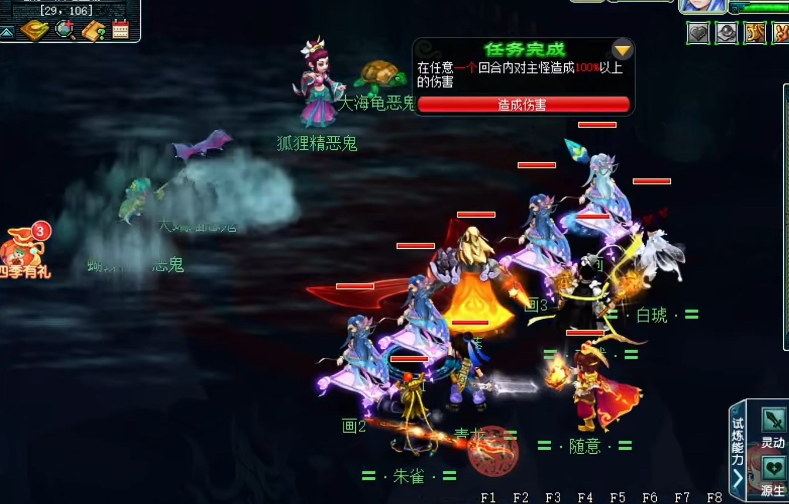 答题环节是四季副本的一个特色,队长需要在每个季节任务完成后回答一些问题,答对的越多,最后的奖励就越好。堆雪人环节也挺有趣的,每个人打完怪会拿到雪球,小雪球加1点进度,大雪球加2点,凑够40点就能完成,记得别浪费雪球,等队长答完题再交。拿奖励的时候,宝箱的数量和质量跟答题正确率有关,所以尽量全对才能拿到最好的东西。四季副本的奖励挺丰厚的,有经验、金币、宝石,运气好的话还能拿到彩果和高级兽决,值得多刷几次。